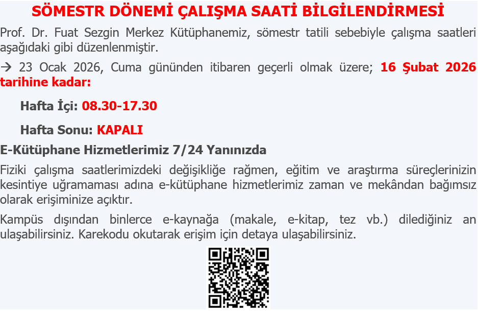 | 1 | Prof.Dr. Fuat Sezgin Merkez Kütüphanesi | –> Çalışma Saatleri için tıklayınız<– | |